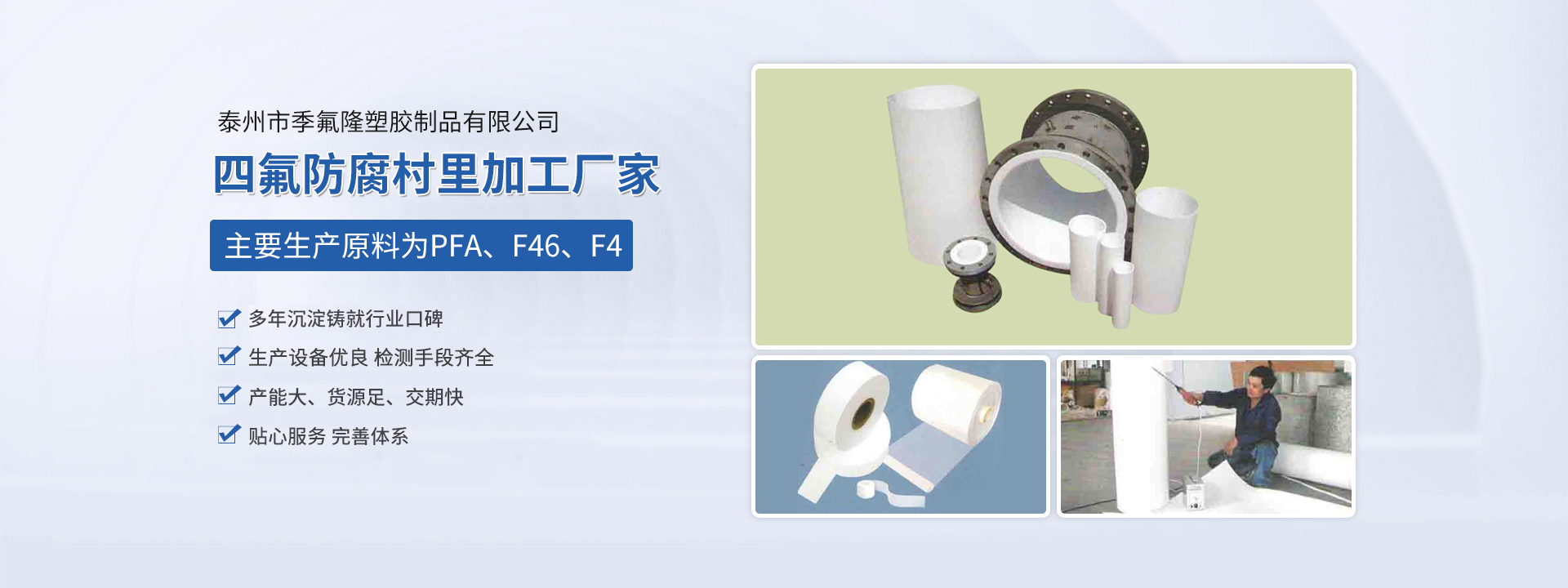 泰州市季氟隆塑膠制品有限公司(江蘇斯瑞沃爾科技發(fā)展有限公司)占地8000平方米,各類專用生產(chǎn)設(shè)備三十多合,現(xiàn)有員工近20人,其中技術(shù)人員10名,均多年從事該行業(yè)生產(chǎn),經(jīng)驗(yàn)豐富。本公司主要生產(chǎn)原料為PFA、F46、F4,主要為電磁傳感器、防腐管道、各種容器反應(yīng)釜三通四通彎頭及各種閥門等產(chǎn)品進(jìn)行防腐村里加工,長(zhǎng)期為德國(guó)、日本、美國(guó)、新加坡等國(guó)在華合資公司配套,產(chǎn)品廣泛應(yīng)用于環(huán)保、油田、化工、造紙、冶金等行業(yè),產(chǎn)品質(zhì)量?jī)?yōu)良,服務(wù)及時(shí)周到,一直深受顧客信賴。